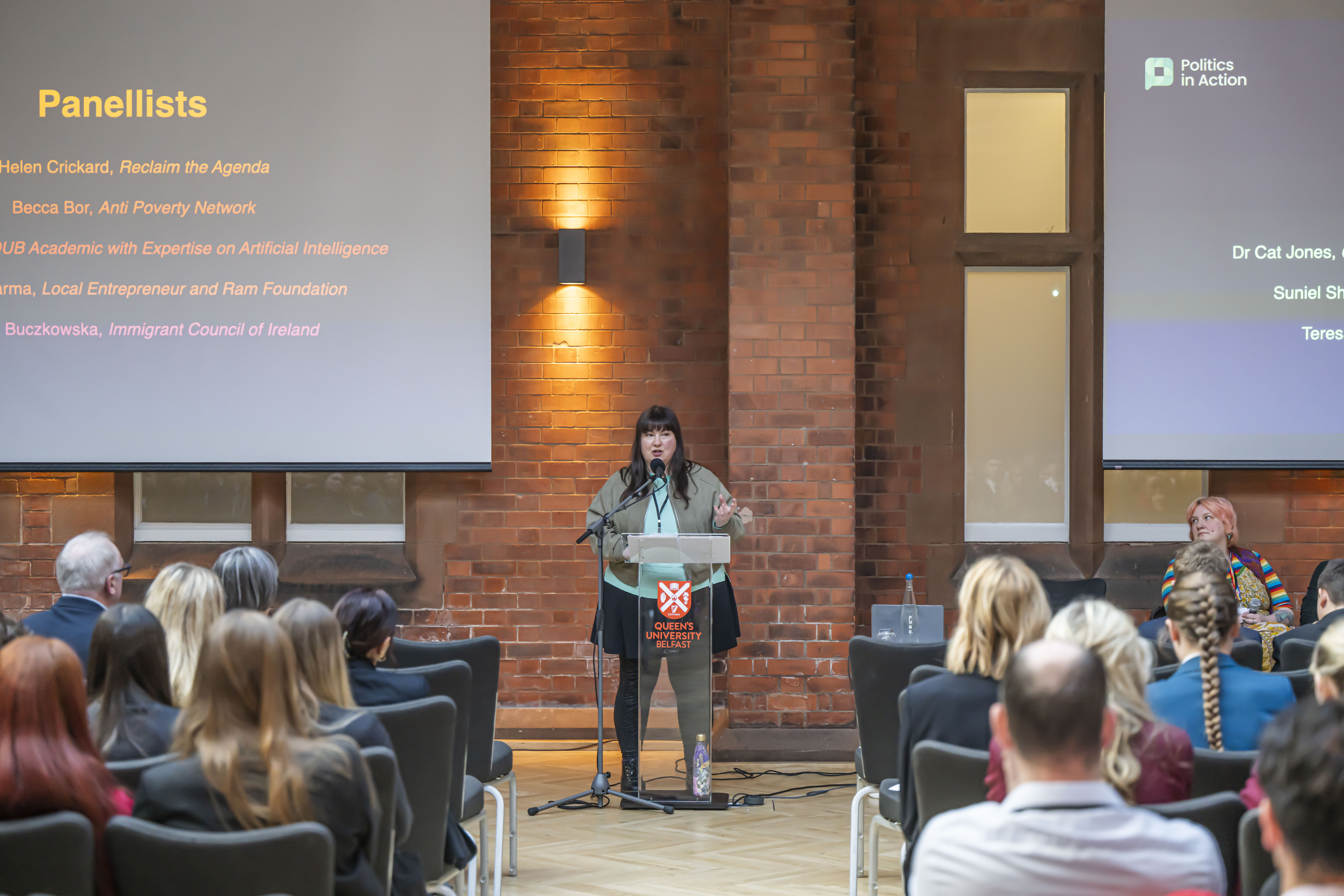 Amanda Ferguson was our brilliant MC for the day and among our guests were our panellists Dr Cat Jones from Climate, Biodiversity and Water at Queen’s University Belfast, Helen Crickard from Reclaim the Agenda, Teresa Buczkowska from the Immigrant Council of Ireland, Becca Bor from the Anti-Poverty Network NI and local entrepreneur Suniel Sharma. We also welcomed politics teachers from across Belfast.